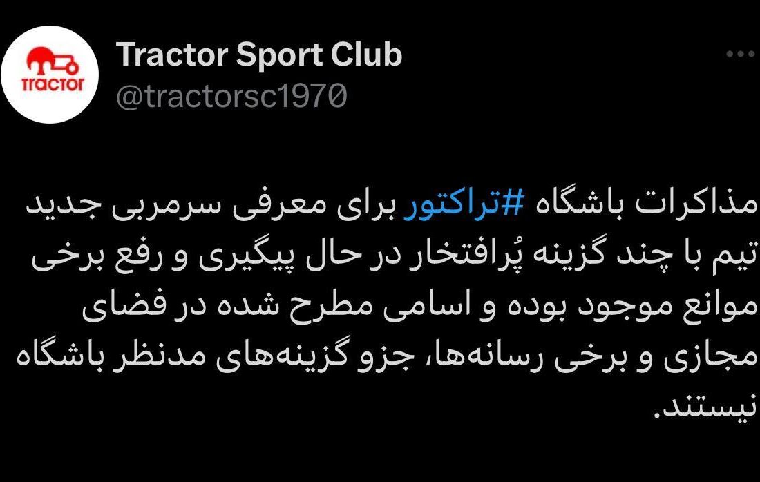 باشگاه تراکتور اعلام کرد اسامی مطرح شده در فضای مجازی و برخی رسانهها، جزو گزینههای مدنظر این باشگاه نیستند.